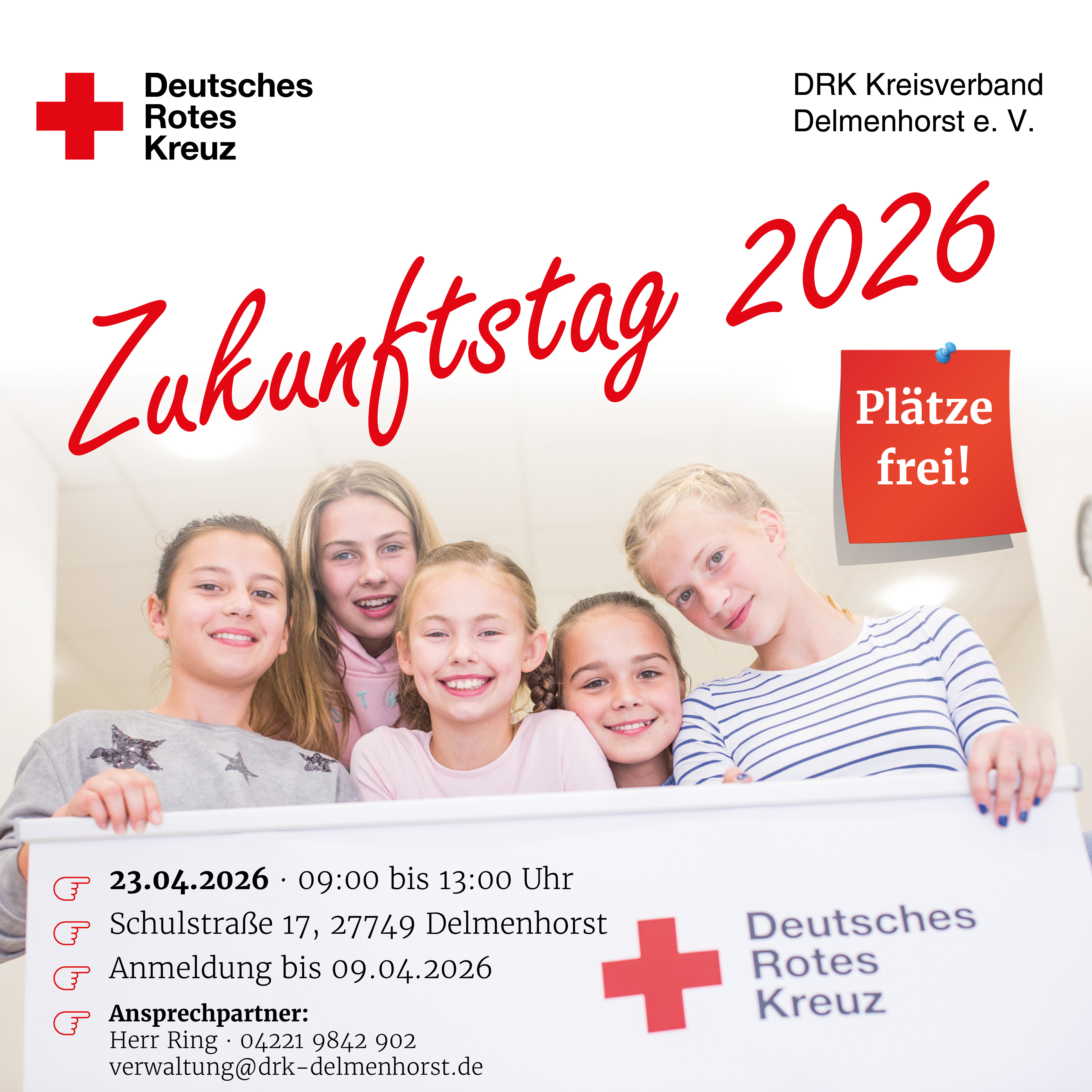 Auch in diesem Jahr lernen jungen Menschen an unserem Zukunftstag mehr über die Arbeit des Deutschen Roten Kreuzes. Wir zeigen, was unsere Organisation ausmacht und welche beruflichen Möglichkeiten wir bieten. Hier geht es zur Anmeldung